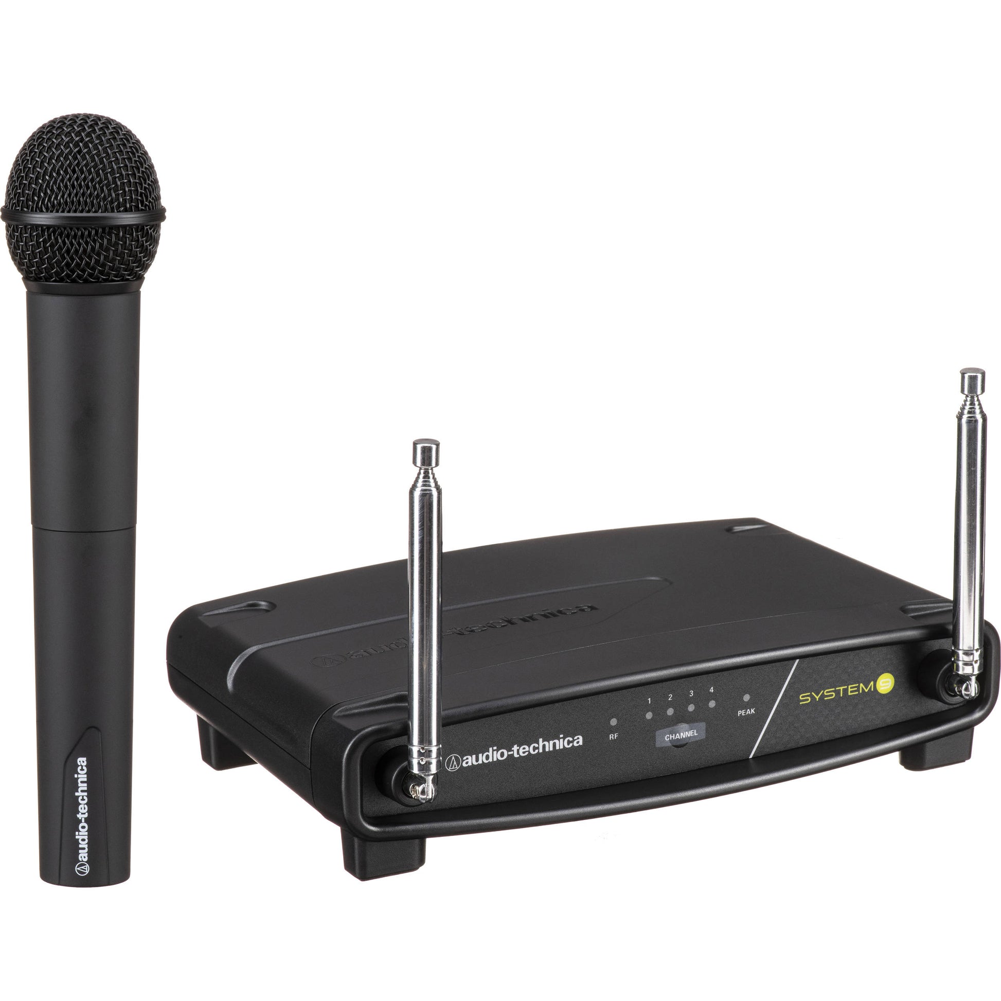 The Audio-Technica ATW-902A System 9 VHF Wireless Handheld Microphone System is designed for live sound reinforcement applications. The system consists of a wireless VHF receiver and a wireless VHF handheld microphone transmitter. The receiver utilizes two dipole antennas for extended range, and allows you to select your VHF transmission frequency from 169 to 172 MHz.